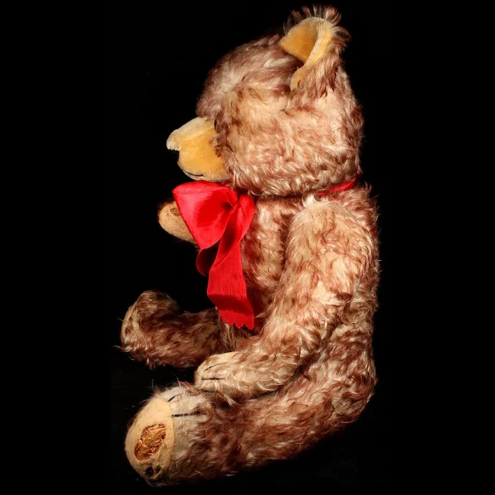 The 70 series bear was made in two versions. One version is the one you see here, with longish brown-tipped mohair covering everything but his muzzle and inner ears, and the other version has silver tipped mohair. I don’t know whether only some sizes and/or dates had which color covering, but I am assuming they were equally available in all the 70 series bears. As you can see from the wear in his paws and feet, Teddy is stuffed with excelsior.