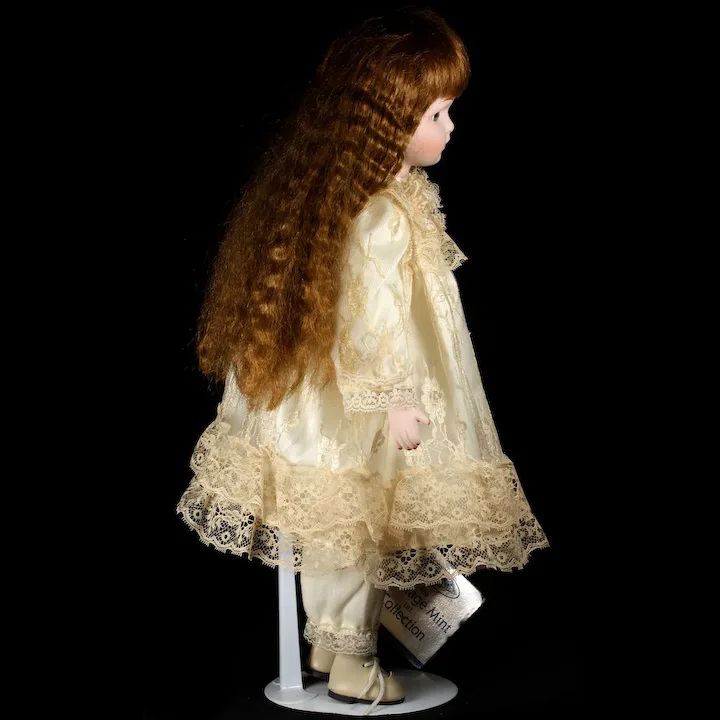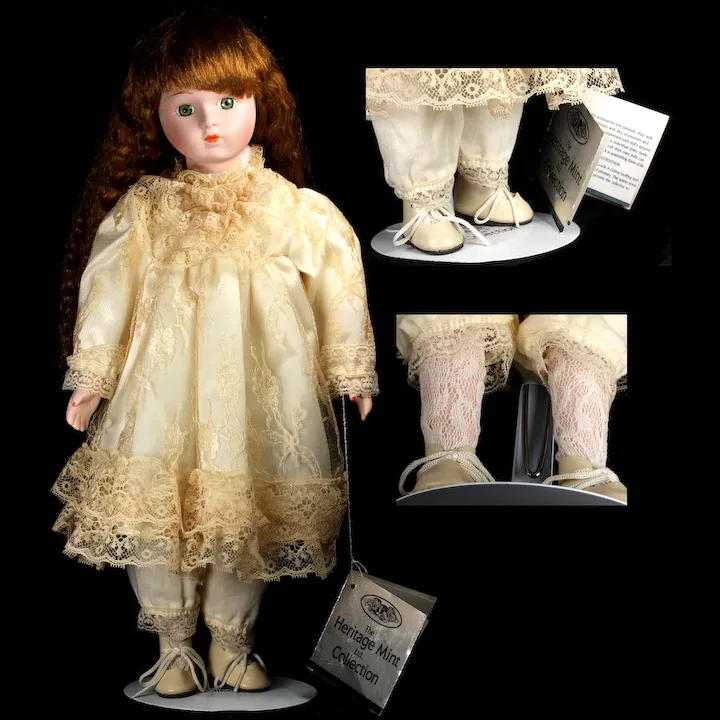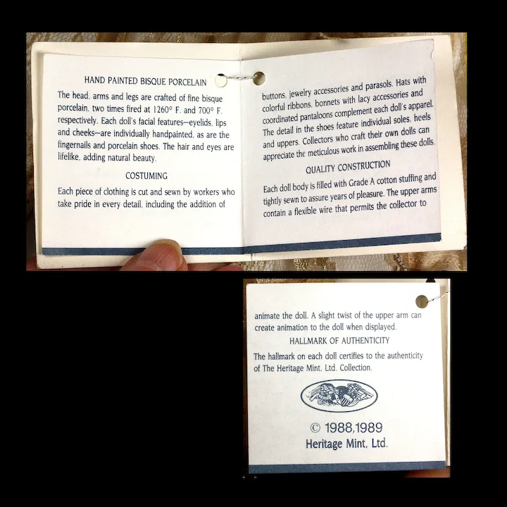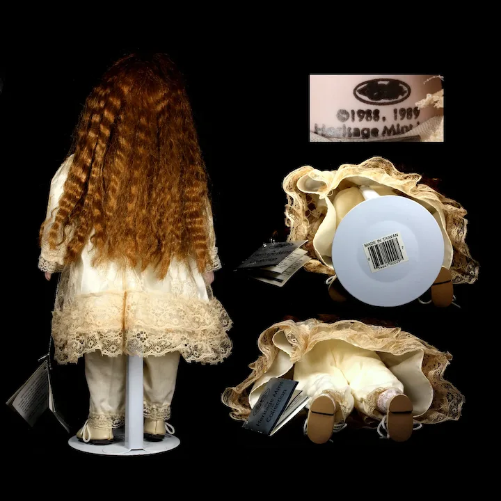 I am really out of my element with this doll. She came to me as part of a collection that included Steiff and other stuffed animals. Heritage Mint, Ltd. is an American company started in 1976, which made/makes collectibles of various kinds. Although they once made many different kinds of items, it appears that they only offer two kinds today, one of which is supplied by another manufacturer. As far as I could determine, the only product Heritage Mint makes today are brass belt buckles. 🙂