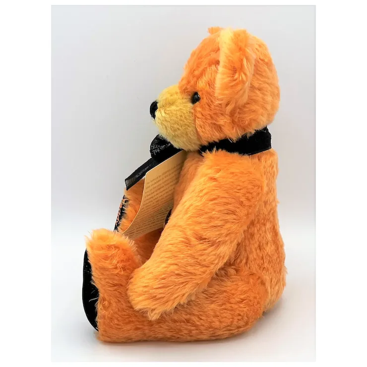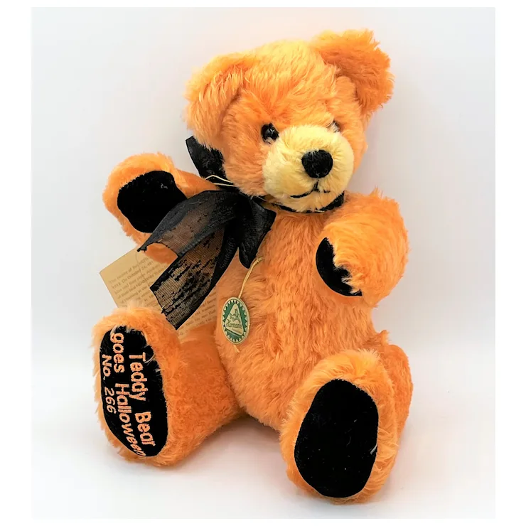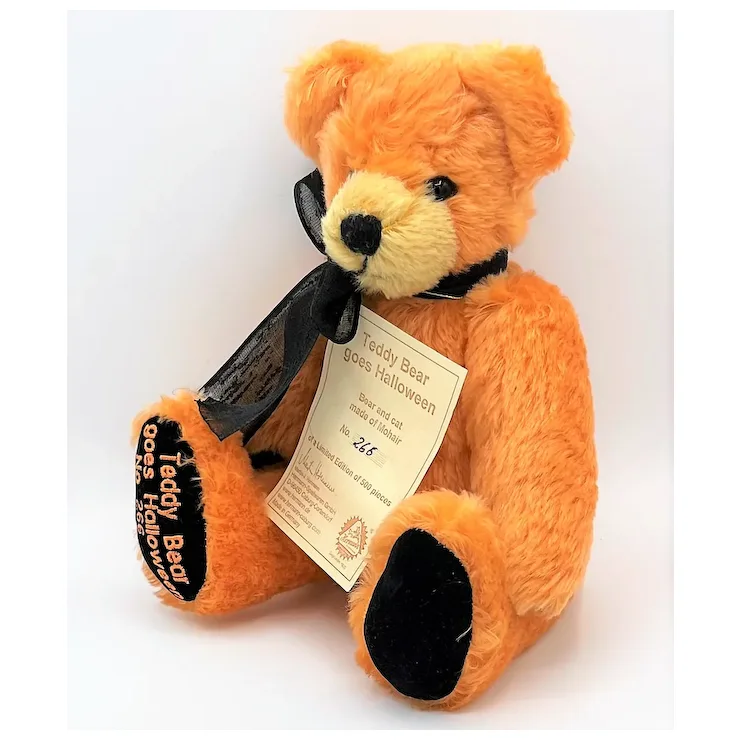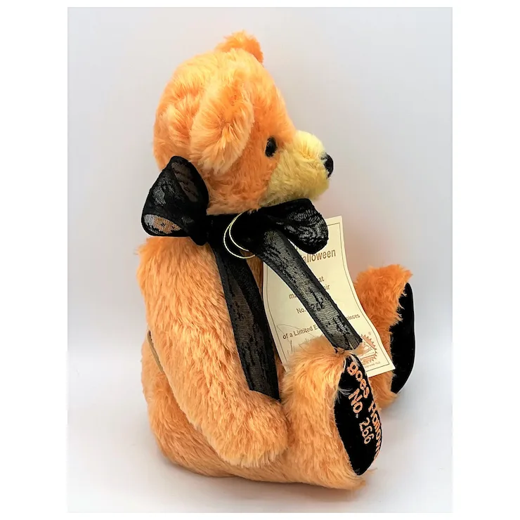 —- his foot is embroidered in orange “Teddy Bear Goes Halloween” No. 266 (his individual LE number)