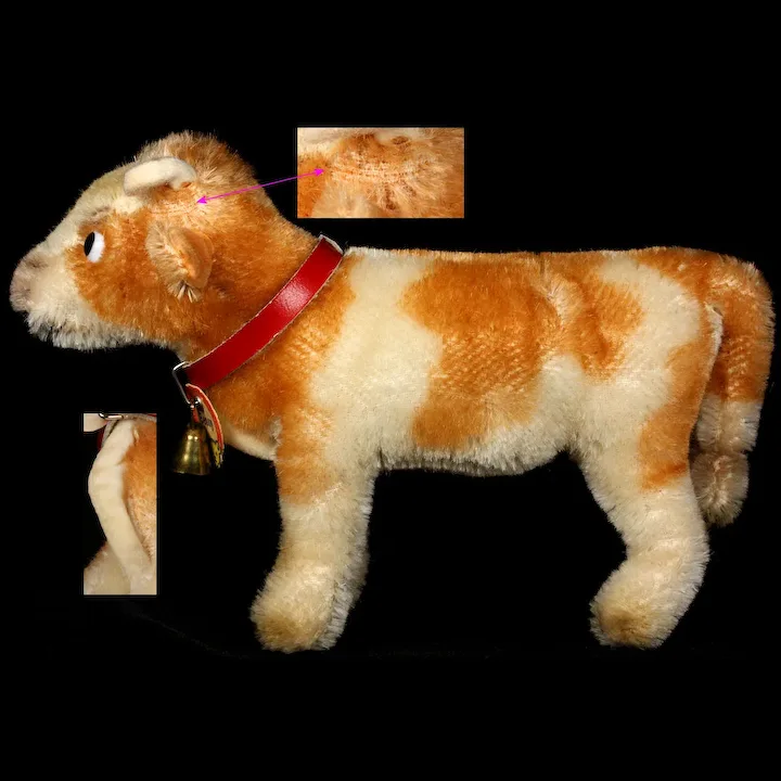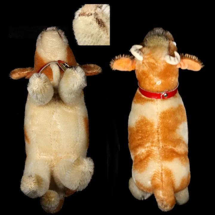 Bessy’s underlying mohair is still white. I doubt it changed much from the way it looked when she left Giengen 60 or more years ago. Her orange Holstein patches don’t appear to have faded, and she has nice airbrushing on her face and legs. Her “eyebrows” make her look as if she is worried about something, but I think they are part of her charm. Her leather collar appears almost new, with only the tiniest indication of wear along the edges.