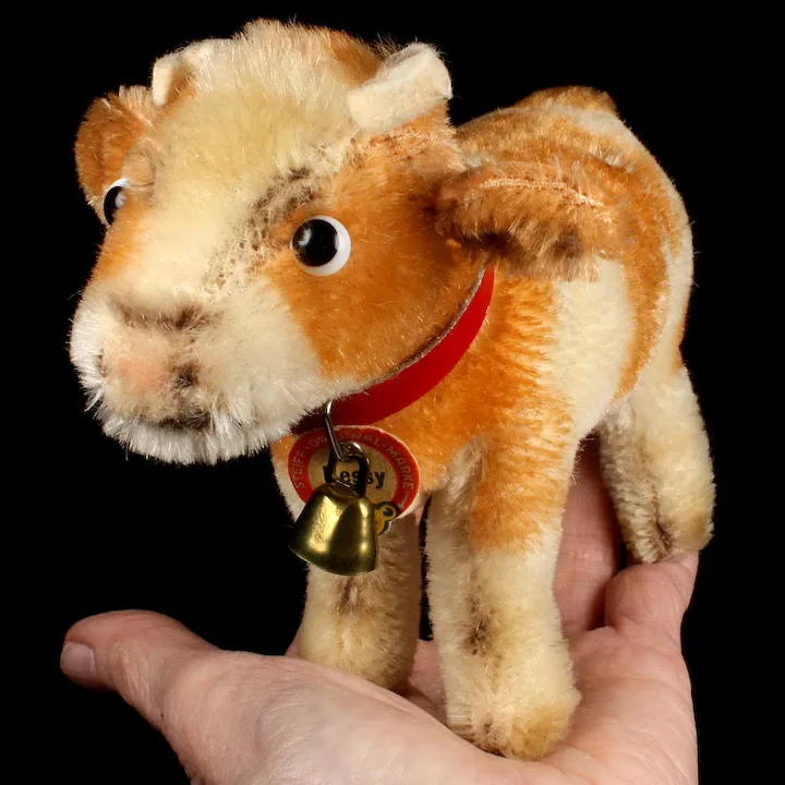 Joining her big sister in my shop is little Bessy (the smallest of the three sisters made in this general pattern). She has only her chest tag, in pristine condition, so I cannot tell you her date of birth more precisely than to say it was between 1958 and 1961. I believe she is from one of the two earliest series, with article number 1312,0, made in 1958 or with article number 1312,03, made between 1959 and 1961. I am confident of this because Bessy’s googly eyes are glass, and her collar is leather (later series would have had vinyl collars).