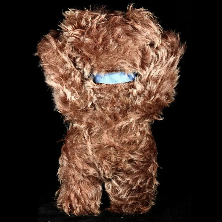 I believe that Zotty will be going to the home of an adult collector, and while his head and face certainly reveal their condition under close scrutiny, the wear would not be that noticeable from a display distance. That’s because the color of the underlying fabric is pretty much the same as the mohair, and because Zotty’s mohair is long and shaggy, it helps camouflage what’s underneath. By the way, this is a good time to mention that Zotty’s name comes from the German word “zottig,” which means “shaggy.”