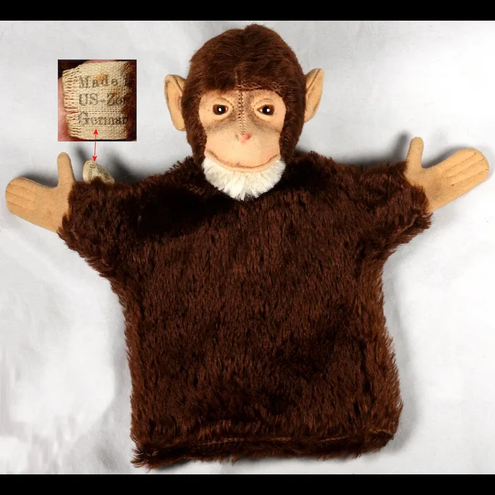 Now a word or two about Jocko’s IDs. I can tell you about the ones he still has and the ones he used to have. The fact that his raised script button is attached on the back of his ear tells you immediately that Jocko is early. The kind of button he wears means a probable birth date no earlier than 1951, although his series was made starting in 1949. This is the way the buttons were attached on the ears of Jocko’s antique relatives. Of course, you know he is not antique, since he has a raised script button and a US-Zone flag on his right arm (printing complete but hidden by mohair), but, as is the case with many immediately post-war animals, there is very little difference between them and their prewar relatives. Another thing that a prewar Jocko would have, and that this Jocko once had, is a chest tag with his name printed in red/brown letters. The shape of the tag would not quite be as angular as that worn by a prewar Jocko, but it would also not be as rounded as the tags worn by later series of this post-war Jocko. Even the article number that would have been printed on the flag of a 1930s Jocko would have been the same as the one that was printed on this Jocko’s flag: 317.