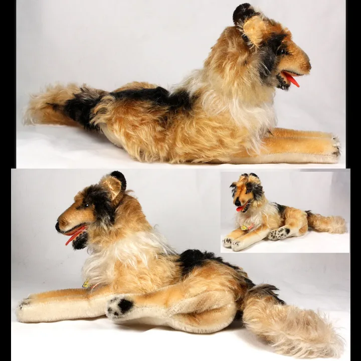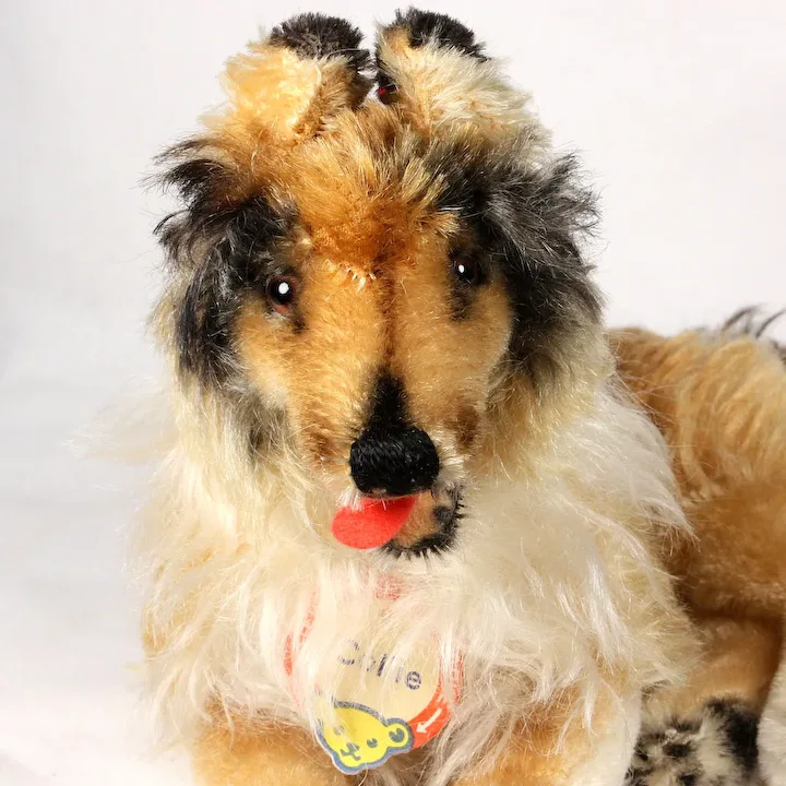 As I say, the existence of the big U.S. market-collie is indisputable, since you can see her flag! I have never seen a situation where pre-worldwide “tryouts” were for only one size of a given animal. Thus, and now getting back to this gorgeous girl, who is without her button and flag, I have to say that I don’t know her possible earliest production date. However, given her glass eyes and the double string by which her chest tag is attached I think it is very likely that she was among the earliest small reclining collies that were made. I am sure that there is, somewhere in the world, a reclining collie with the number “2325,90” printed on her flag.