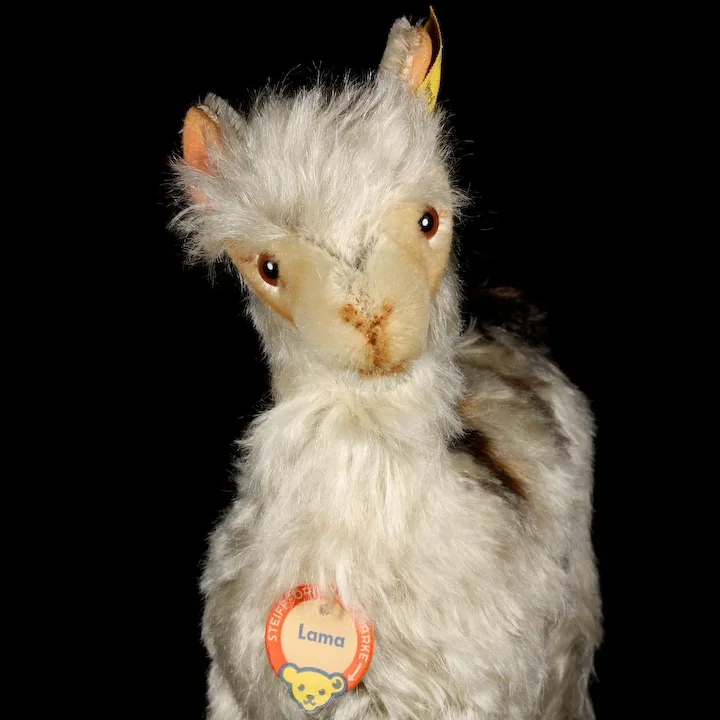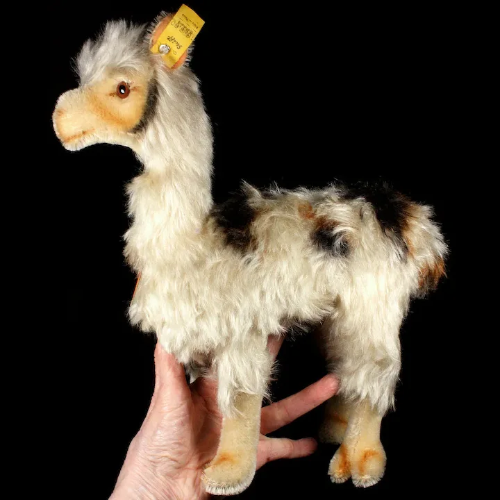 I am thrilled to offer this rare handsome guy to you! He is the middle size Steiff llama (the German’s leave off an “l”) of the family of three, and he joins his little brother elsewhere in my shop.