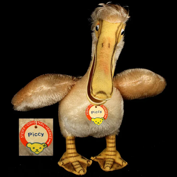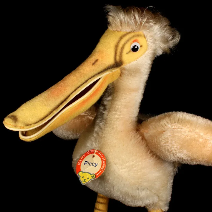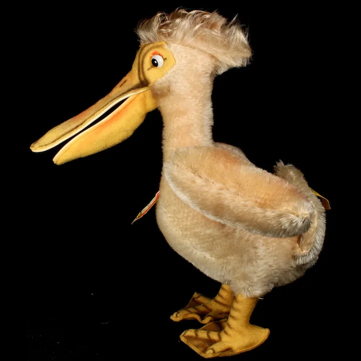 I am sure you have heard the expression, used metaphorically about a person, that he is a “rare bird.” Piccy the pelican is LITERALLY a rare bird—among Steiff birds—because he was only made for three years, 1959 to 1961. If that sentence looks familiar to you (and much of what you read below will too), it is because I started my description of Piccy’s little brother the same way, and these dates apply to both of them. While they are both rare, this Piccy is far rarer; the last one I helped find a new home flew away from my shop in 2012!