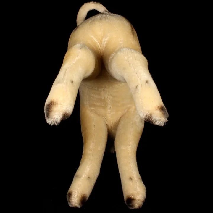 Back to his ears, you can see that Yuku’s button and flag are attached to his left one, with article number 1335,00. The “35” in that number indicates Yuku’s catalogued size, measured to the top of his head. His actual height is 30.5 cm, or just over a foot. Whether he conforms exactly to his “official” size is no big deal, but it WOULD be a big deal if you did not allow him enough display room to include those now-erect horns! They are about 16 inches from Yuku’s standing surface, so you would want to have at least another inch of display space beyond that.