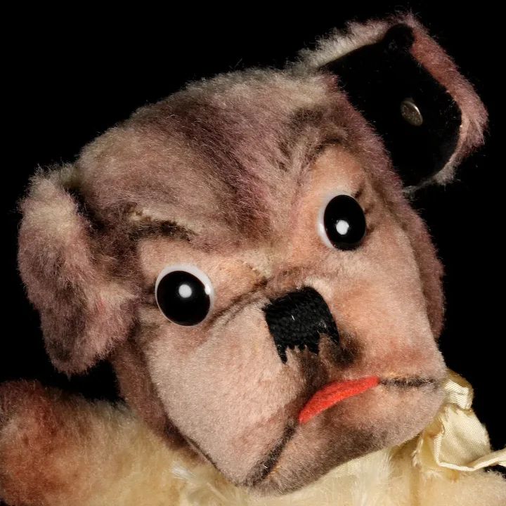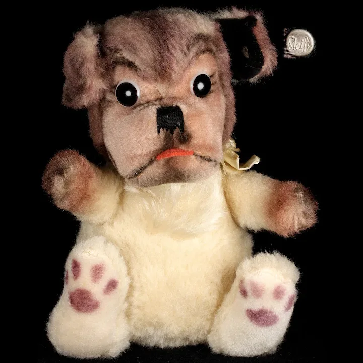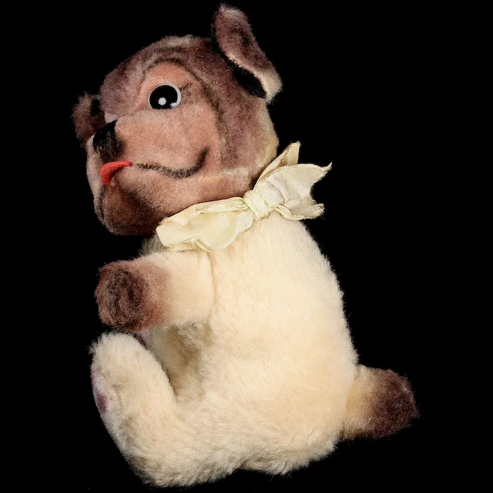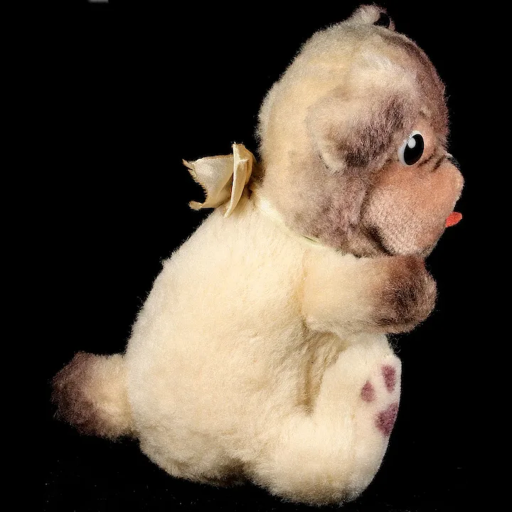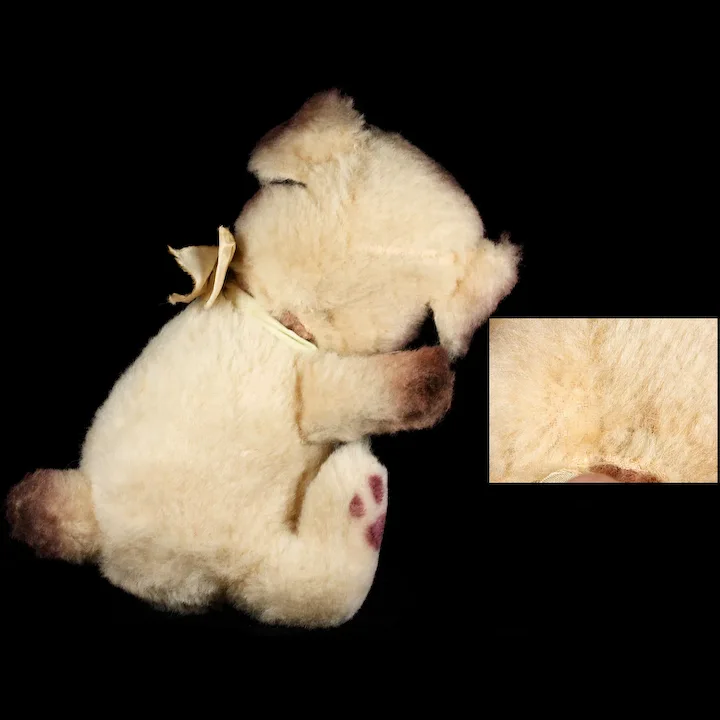 At the end of my list of minor condition issues is one that is always last; I refer to Mopsy’s squeaker. If you press in on her belly, where you would expect to find her squeaker, you would think she had none. That’s because Mopsy’s “bark” is located in her back, about 3/4 of an inch above her tail. The reason an animal’s silence is never a big deal to me is my assumption that Mopsy will be displayed in an adult collector’s vitrine or cabinet, and whether she barked or not would be impossible to tell when she looked sweetly back at you with those big glass googly eyes!