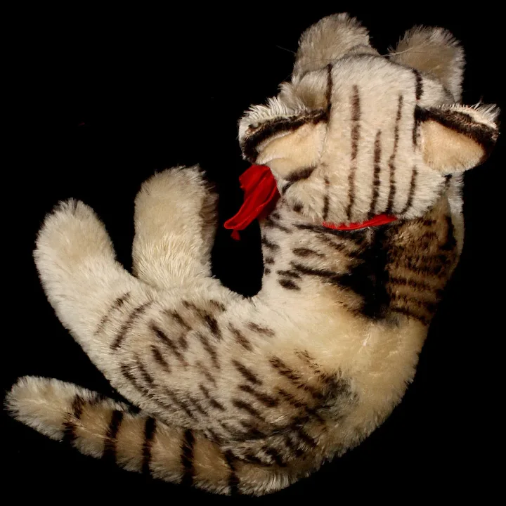 This almost-life size cat is the largest of three sisters. You know that from Fiffy’s article number 2325.00, in which the “25” indicates her size in centimeters. That entire number is totally legible on Fiffy’s flag, even though it has faded somewhat.