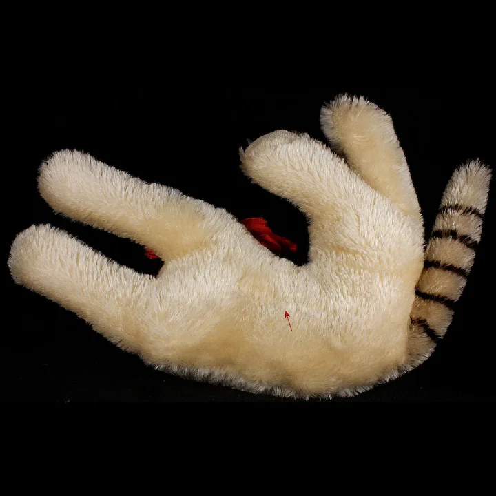 I always have trouble coming up with a way to measure the reclining animals that yields the number that designates their size in the catalogue. The closest I could get to 25 cm is the approximate diagonal “line” you could draw between the tip of Fiffy’s left front paw and the place where her tail joins her body. That comes to approximately 30 centimeters, or about one foot. Fiffy’s height, from her sitting surface to the top of her head, is about 6 1/2 inches. That is NOT the way Fiffy arrived,