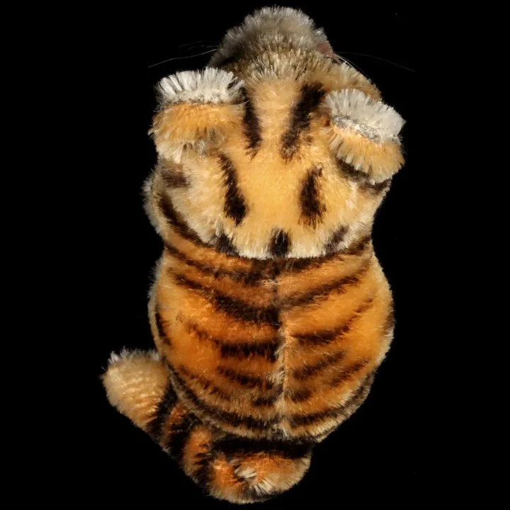 Tiger has a tiny touch of wear under his chin, but that’s about it. Most of his orange and black coloring has only slightly faded, and I would not even have known this if his near-mint vitrine brother were not available for comparison. I don’t know how he would have been displayed or stored, but his head does have some more-noticeable fading. Despite that, Tiger still has quite-apparent rose-colored accents on his face—under each eye, at the tip of his nose, under his black-floss mouth, and even a tiny, minimally-detectible, application on the insides of his ears.