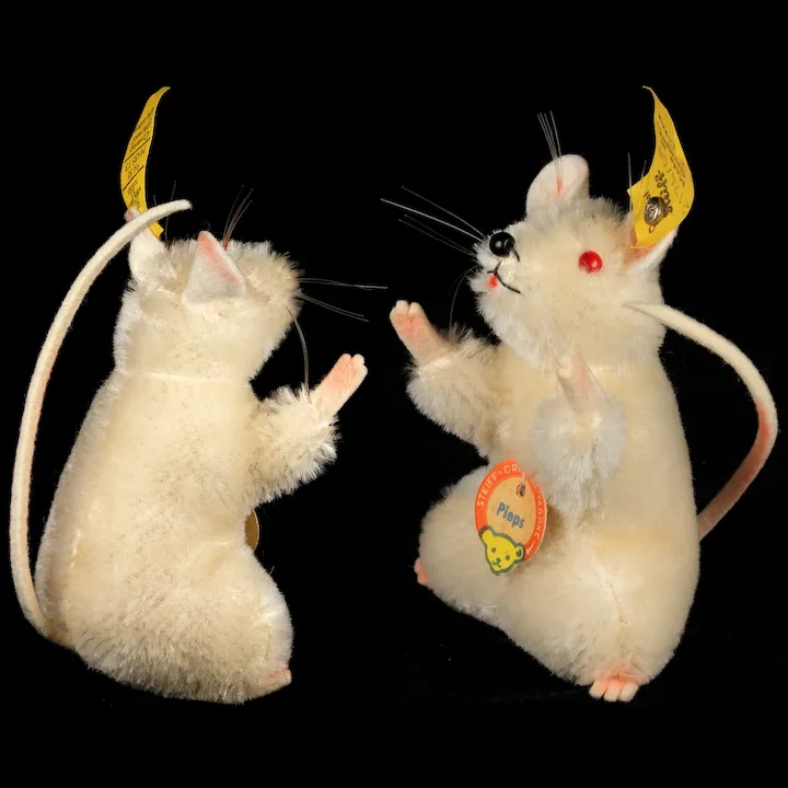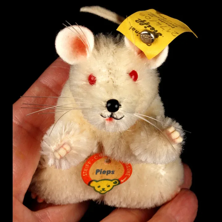 Pieps’s article number, 2174/08, was on the flags of the last series of the albino version of Pieps, which was used during the years 1968 to 1978. That’s the way she is the first of her kind, produced during 1968, the first year of that series. I know Pieps’s age because her button was changed in 1969 to the “lentil,” incised script, button. She is wearing a raised script button, which was last used in 1968, thus her 55-year old age.