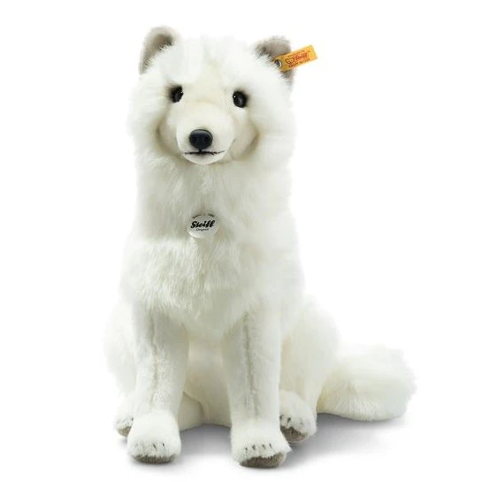 A faithful companion from the Arctic tundra. Measuring 37 cm tall, the majestic Arkin arctic fox is wonderfully lifelike! His long, super soft, white fur coat is made of high-quality plush – from the top of his head right down to his bushy tail. His short-pile legs are finished with gorgeous brown soles, while his carefully crafted, short-pile face features big eyes, a rounded faux leather nose and semi-circular ears. Airbrushing adds unique expression to his face and gives his feet their characteristic claws.