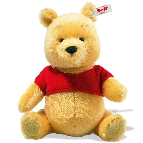 In the early 1960s, Walt Disney was able to acquire the rights to A.A. Milne’s Winnie the Pooh character. Because Walt fondly recalled reading the Pooh stories to his daughters, he was pleased to bring the character into the Disney fold. Under his supervision, Pooh’s design was “modernized” for his first screen appearance in “Winnie the Pooh and the Honey Tree”, a 1966 theatrical short subject. Pooh’s new “look” in this film would become the definitive version of the character for a new generation of fans – those born from the 1960s through today. The Steiff Disney Miniature Pooh Bear is made of blond mohair and five way jointed. He wears the trademark red shirt popularized in the Disney films and television programs. This “modern” interpretation of the character beloved by all – no Pooh, Steiff, or Disney collection is complete without it!