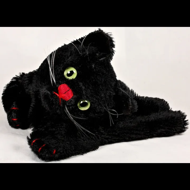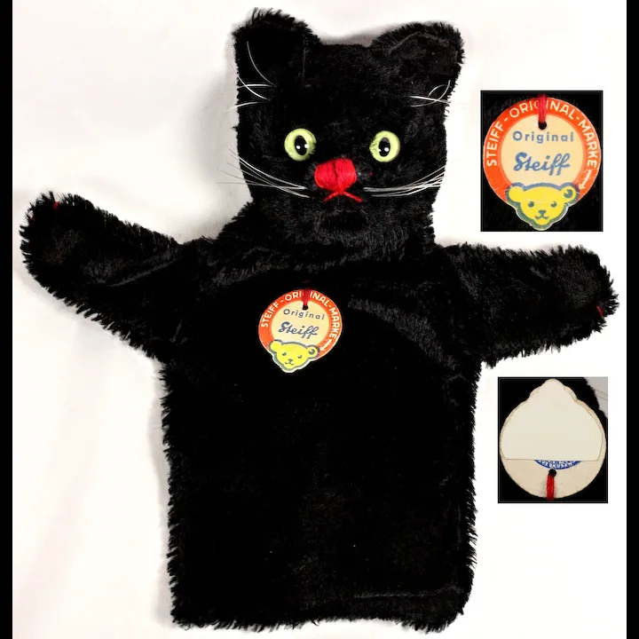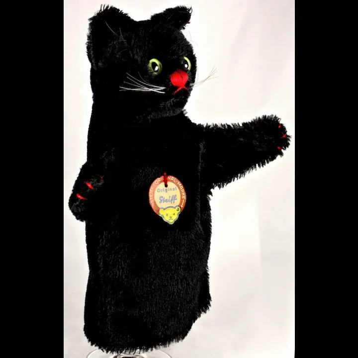 As I have said about Tom’s two full-bodied cousins in my shop, I don’t see anything particularly MALE about this puppet, but, as it does with those humpback cats often referred to as “Halloween cats,” Steiff categorizes this hand puppet as a “Kater,” the German word for “tomcat.” If you have a black female cat who looks exactly like this puppet, and you would like to have a mohair facsimile of her, please don’t be deterred by Steiff’s categorization.