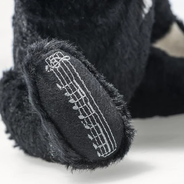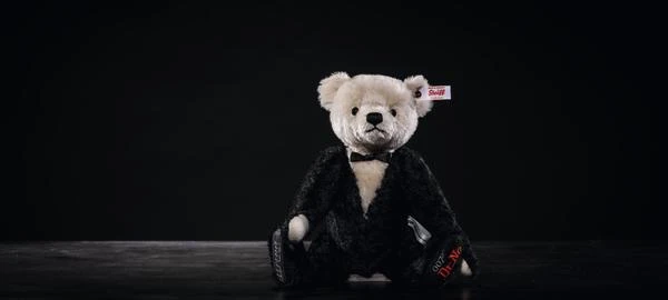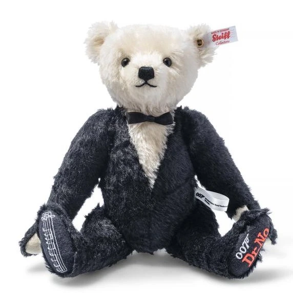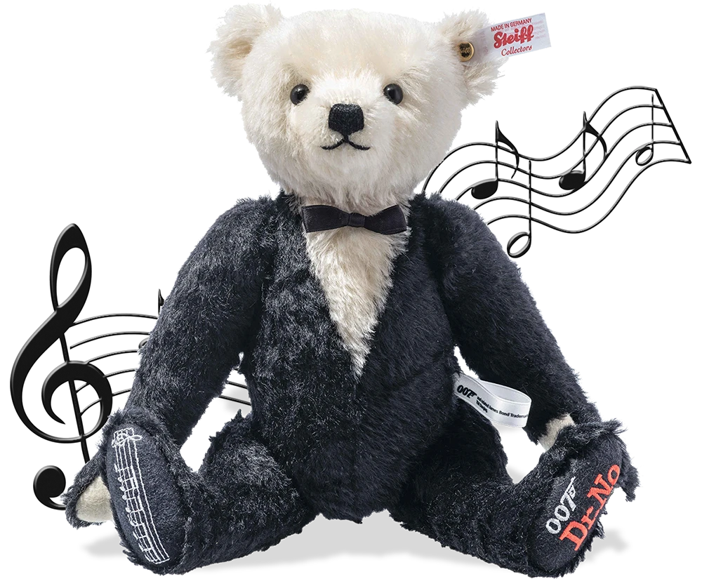 Bond, James Bond. This unique musical Teddy bear plays one of the most recognisable tunes in the world, the iconic 007 theme tune. A true leading man, our Bond bear is dressed to impress in his mohair dinner jacket with perfectly fitting bow tie. His left sole is adorned in striking red with an embroidered 007 & Dr. No logo as a tribute to the first film in the series (1962).