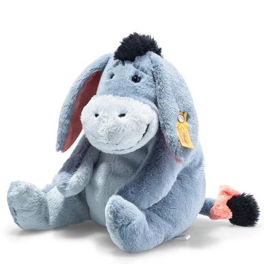 Measuring 25 cm tall, our bluish-grey Disney Eeyore is made of cuddly soft plush and is perhaps the most slow-paced donkey in the world. He has long lop ears which are pink on the inside. And his little black button eyes go beautifully with his short black mane. His eyebrows, nostrils and mouth are all embroidered, and a magnificent white belly and round snout complete the look perfectly. Disney Eeyore is part of a series of new Steiff cuddly toys with a Disney licence. And we’re proud of this!