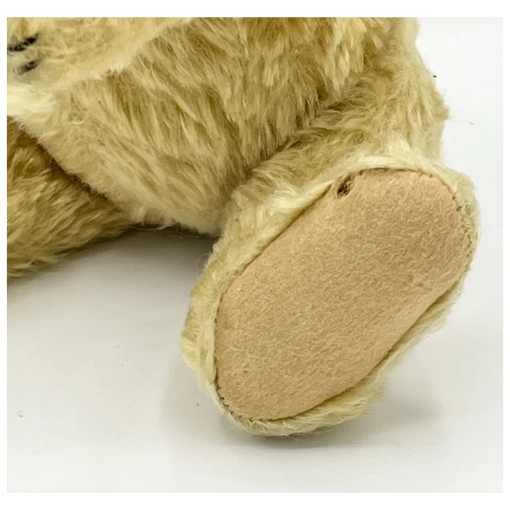 – two things to point out: on the left foot there is a small hole at the seamline (a talented hand-sewer could repair this by moving the entire seam about 3 mm) although it is not immediately noticeable because excelsior is the same color as the paw pads; there is a smudge which discolors a small portion of the distal right arm paw pad (I thought it was a shadow at first)